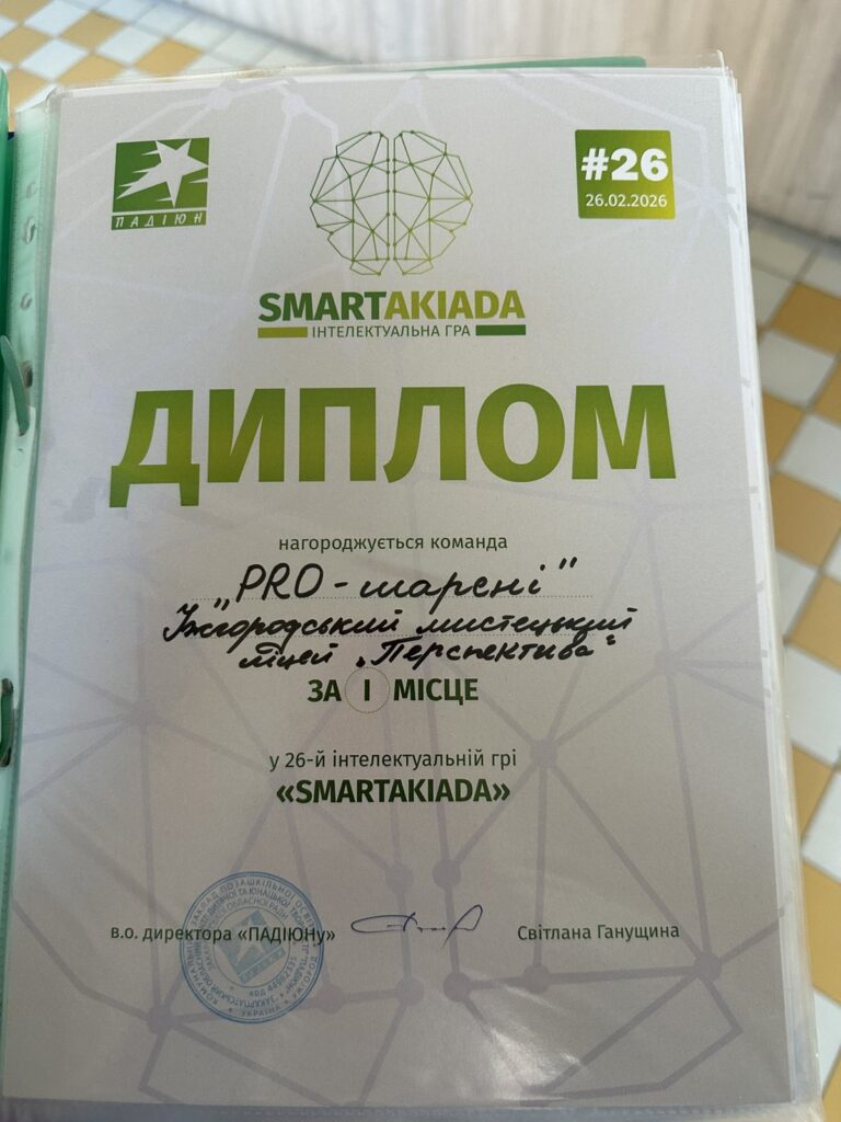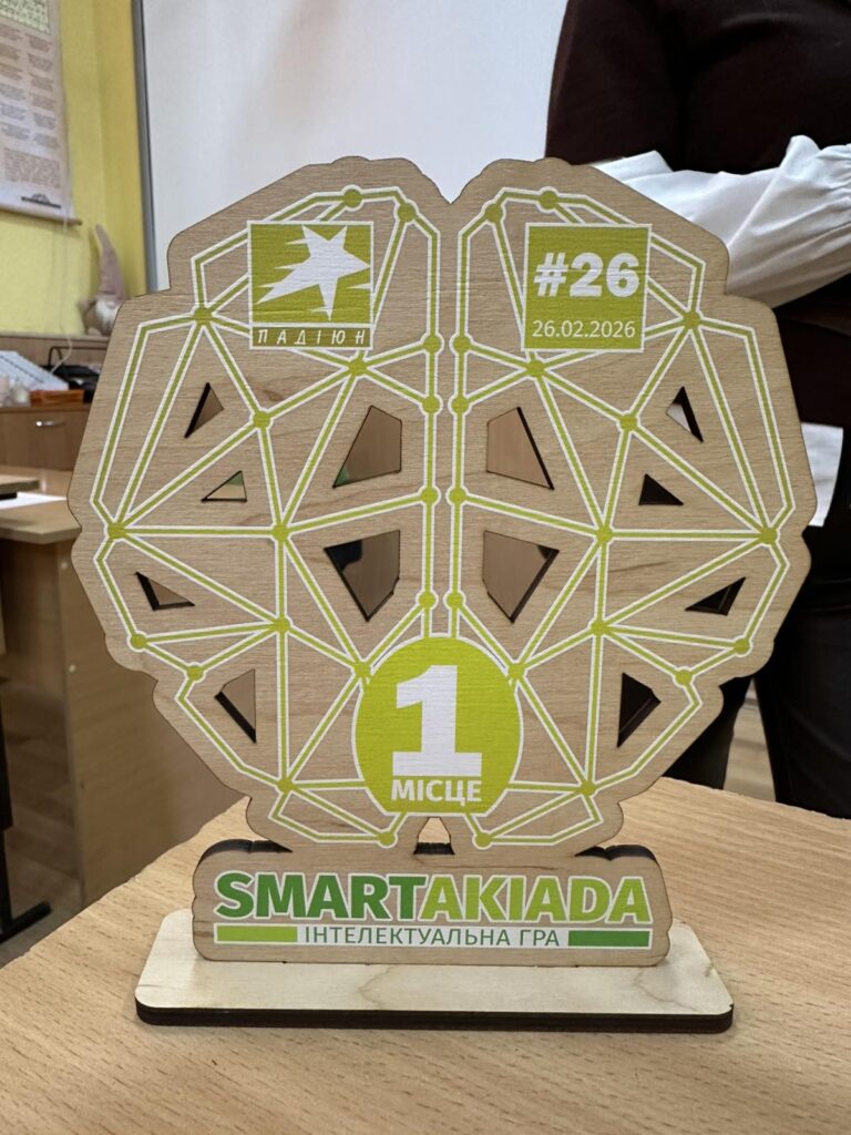 Вітаємо команду нашого ліцею “PRO-шарені” (керівник команди: Граб Оксана Іванівна) з 1 місцем на 26-ій інтелектуальній грі “SMARTAKIADA”: вибороли кубок, з’їли смачну піцу та виграли медовий пряник, який отримує команда, що дала єдину правильну відповідь.