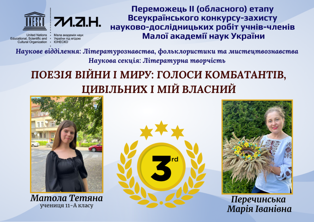 Учениця 11-А класу Матола Тетяна разом із керівницею Перечинською Марією Іванівною посіли 3 місце у II (обласному) етапі Всеукраїнського конкурсу-захисту науково-дослідницьких робіт учнів-членів Малої академії наук України.