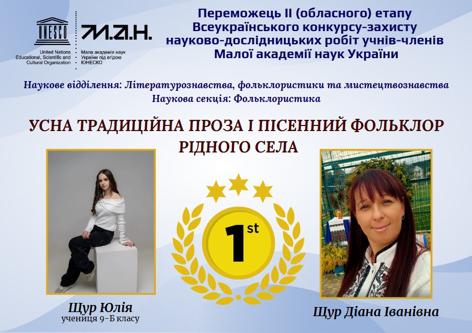 Учениця 9-Б класу Щур Юлія стала переможницею II (обласного) етапу Всеукраїнського конкурсу-захисту науково-дослідницьких робіт учнів-членів Малої академії наук України у науковому відділенні «Літературознавство, фольклористика та мистецтвознавство», наукова секція «Фольклористика».