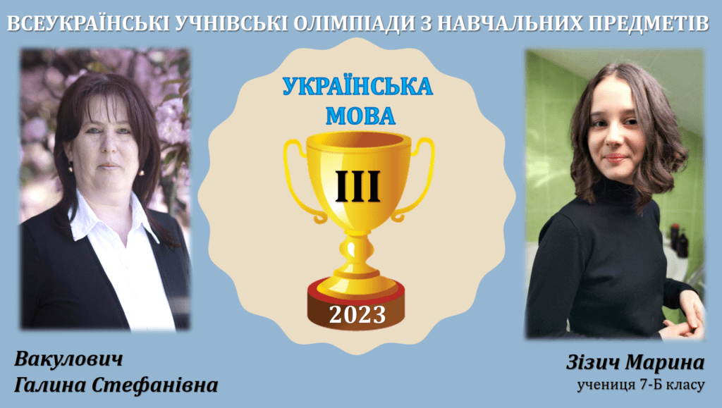 Чергова результативна співпраця вчителя та учениці принесли нашій школі призове місце на ІІ (міському) етапі Всеукраїнських учнівських олімпіад з УКРАЇНСЬКОЇ МОВИ: Вакулович Галина Стефанівна та учениця 7-Б класу Зізич Марина.