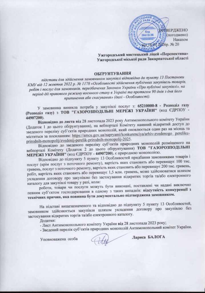 Обгрунтування закупівлі послуг (наказ №20, розподіл газу) 29.01.2026 Обгрунтування закупівлі послуг (наказ №20, розподіл газу)