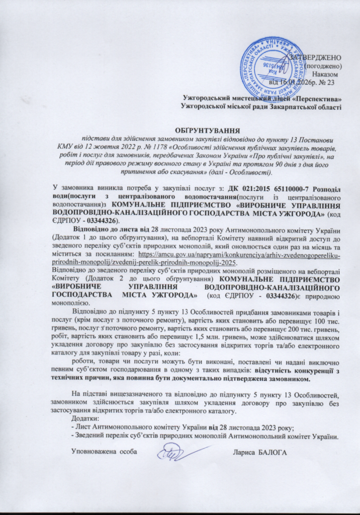 Обгрунтування закупівлі послуг (наказ №23, розподіл води) 29.01.2026 Обгрунтування закупівлі послуг (наказ №23, розподіл води)