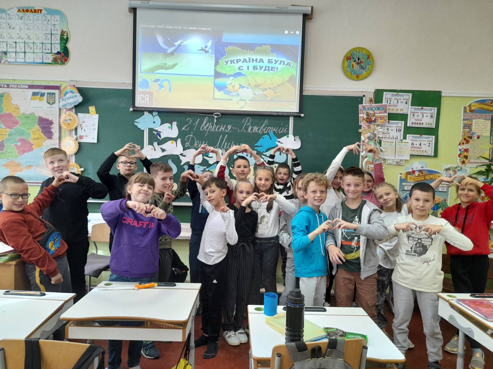 21 вересня-Всесвітній День Миру! Учні 4-Б класу дуууже старалися!!! Голуби миру оселилися у нашому класі!!! МИ за Мир!!! Бажаємо скорішої перемоги нашим воїнам!!!! Все буде Україна!!!![]()